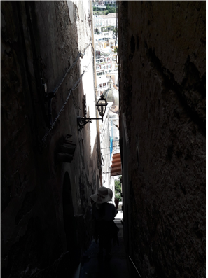 포지타노에서 매일 바닷가에서 파라솔을 빌려 일광욕도 하고 수영하고 맛집도 찾았다. 더 절벽을 위로 올라가 해안 전체를 내려다보이는 맛집에서 해물 튀김과 맥주를 먹었다. 우리는 해안까지의 내려갈 때나, 또는 그 절벽 위의 도로까지 오를 때 계단을 이용했다. 이태리의 모든 여행이 그렇지만 특히 포지타노 같은 해안 마을은 튼튼한 자신의 두 다리로 걸을 수 없으면 다닐 수 없다. 45~60도 정도의 경사진 좁은 계단을 다녀야 한다. 처음 마을이 만들어질 때 차를 고려하지 않고 세웠기 때문이다. 아주 좁은 길로 차가 들어와도 중간에서 끝나고 게다가 교통체증으로 3~4배의 시간이 걸린다. 2년 전 교통사고로 입원했을 당시는 다시 이런 여행을 생각도 못 했는데 잘 오르니 딸은 물론 나 스스로도 신기했다. 그 골목길 담벼락 좁은 사이에서 아름다운 아순타 성당이 여며 잠시 그곳에서 스케치를 했다.